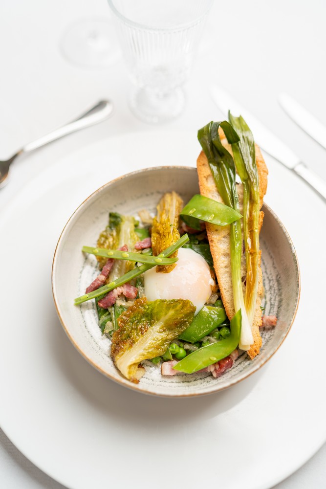 Brioche perdue salée & mousse de chèvre frais Brioche toastée, chèvre frais fouetté citron–thym, pignons torréfiés