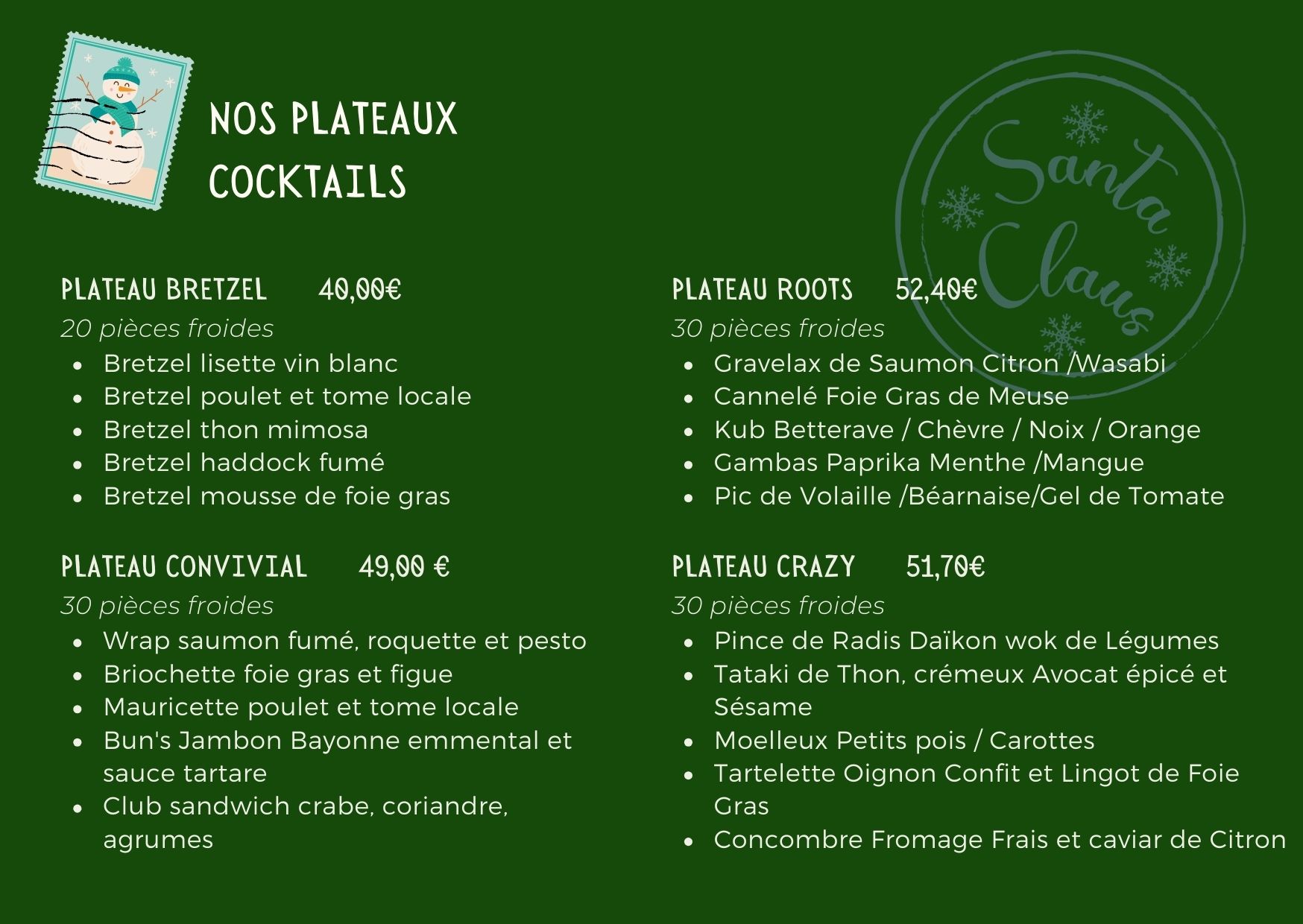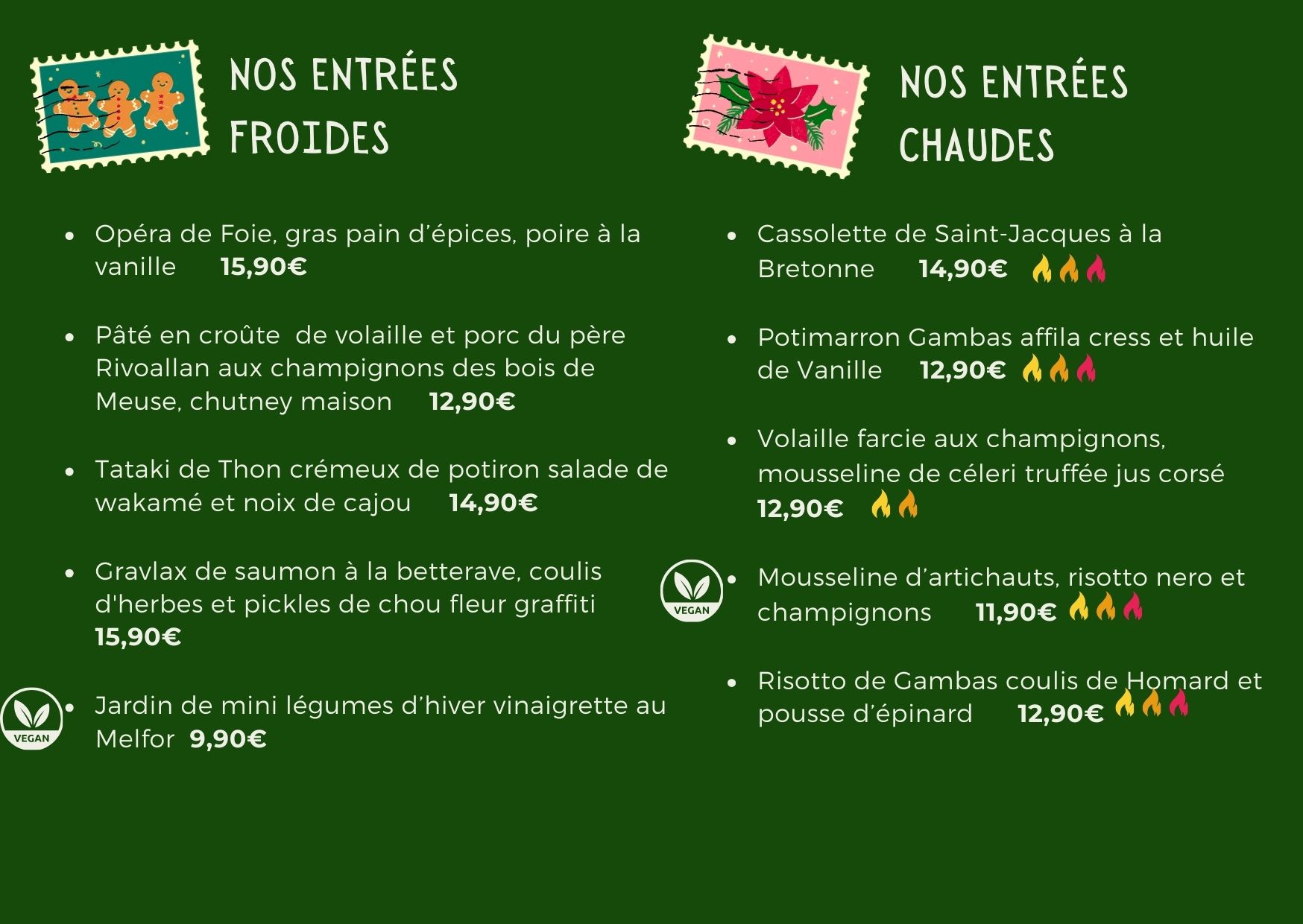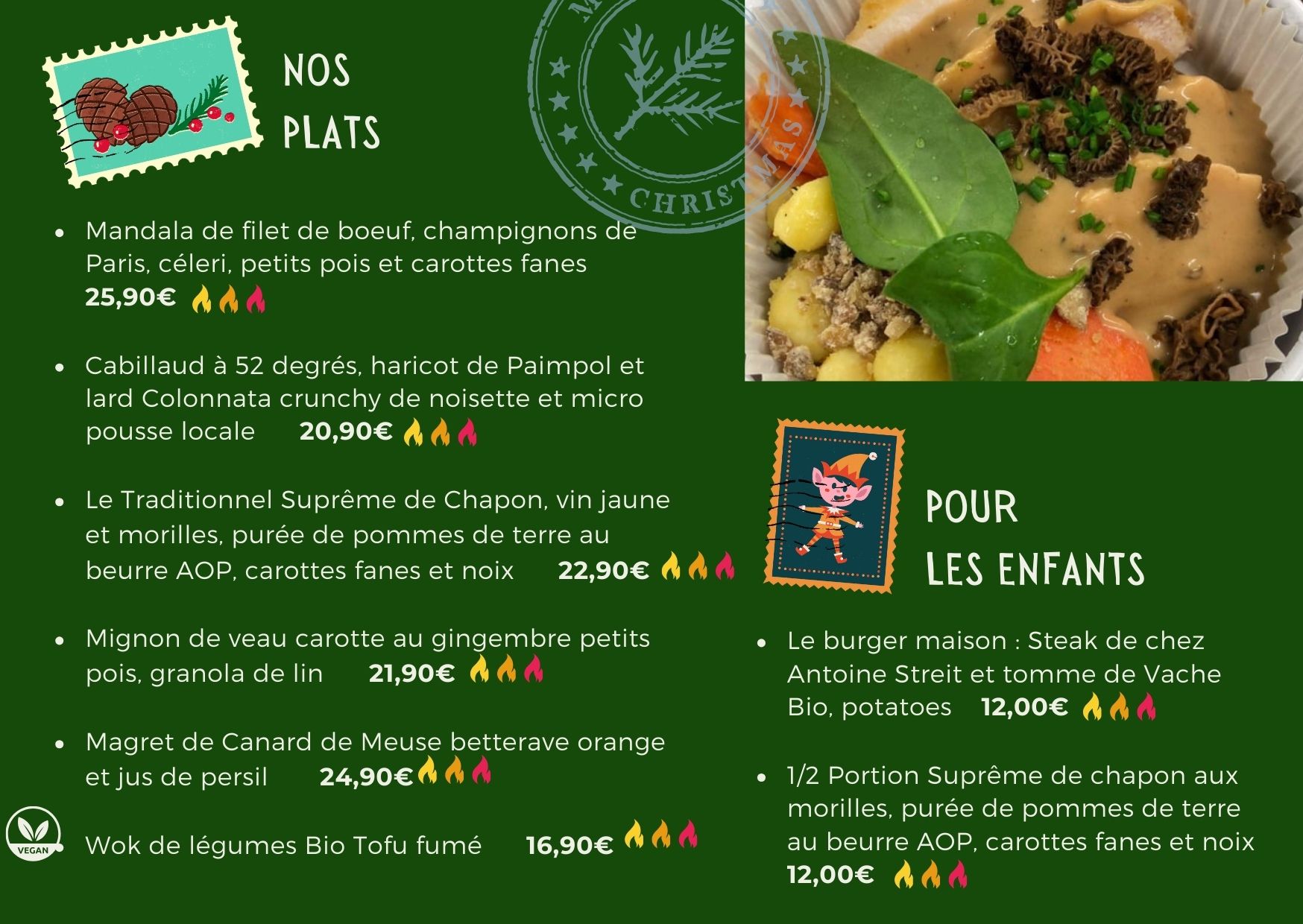 - Pour le repas de Noël, passez commande avant le mercredi 18 décembre à 16h. Vous pourrez venir récupérer vos plats le mardi 24 décembre, entre 9h et 15h, à notre adresse : 58 rue du Béarn, Cosnes-et-Romain.
