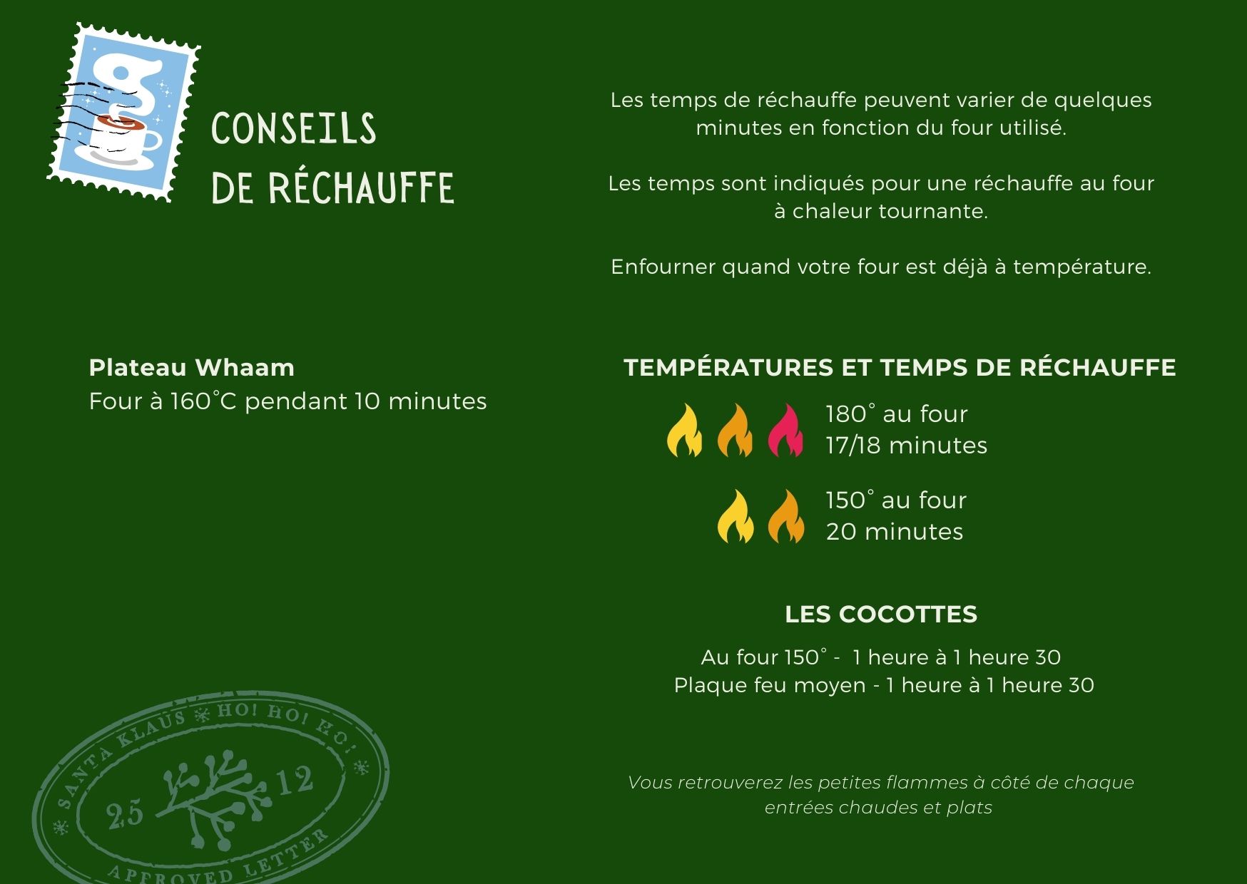 Nous finissons de cuisiner vos plats quelques heures avant votre venue. Ensuite, nous les conservons en chambre froide pour préserver leur qualité. Lorsque vous venez chercher votre commande, notre chef Nicolas vous donnera des conseils pour bien réchauffer les plats. Si vous avez opté pour la livraison, ces instructions vous seront fournies sur une notice explicative. Vous les retrouverez également sur notre site dans le menu des fêtes 2024.